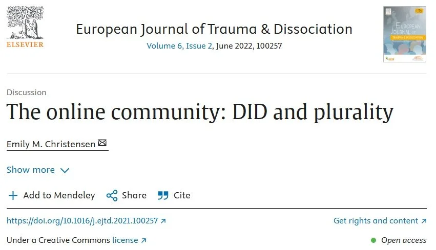 KeywordsCultural competency; Online Support groups; Dissociative identity disorder; Plurality; Plurals; Social media; Differential Diagnosis; Peer support; Reddit; Social Media; Community; System Speak; S3C Foundation; Clients; public; conversation; CPTSD; DID; OSDD; Symposia; Symposium; Zoom; Sponsor; Platform; Mighty: Podcast; Emma Sunshaw